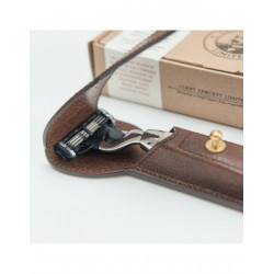 Der Rasierer ist sicher in einem wunderschön handgefertigten Premium-Lederetui mit Messing-Windenbefestigungsschraube untergebracht. Entwickelt, um Ihren Captain Fawcett Mach 3 Sicherheitsrasierer aufzunehmen, ist er einfach das ideale Reisezubehör, um die Klingen vor neugierigen Händen zu schützen.